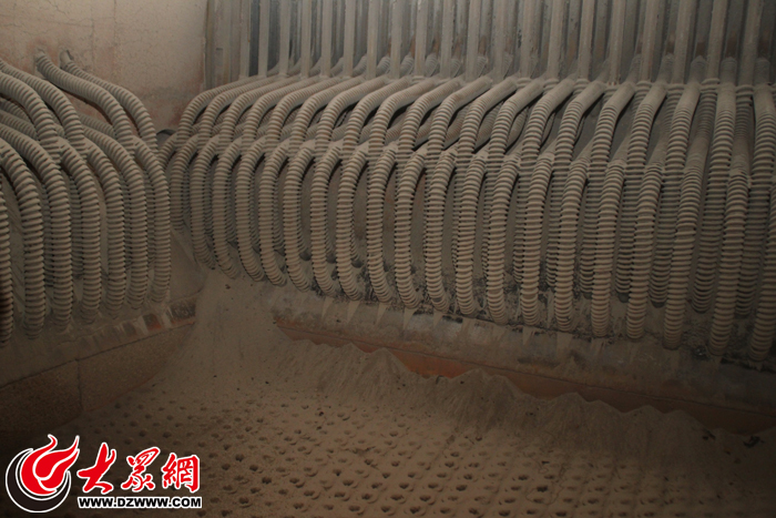 随后,大众网记者跟随着清灰工人进入该热源厂3号水煤浆锅炉内部,体验了一把“锅炉清灰人”的工作。清灰做业时,工人需要穿上连体工作服,戴上防尘罩和安全帽,穿过直径约50公分的入口进入炉膛,锅炉内部漆黑狭窄,通过照明灯可以看到炉膛内部到处都是灰尘,稍微一走动便在空气中漂浮,很快身上就蒙上了一层灰尘。